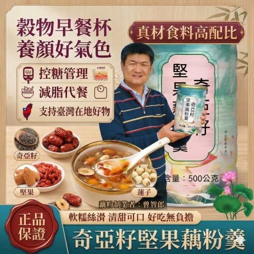 【台南白河奇亞籽堅果藕粉|養生代餐首選】台南白河曾智郎驚天動地的「三高剋星」!每天一碗,溫潤腸胃好舒適!天然奇亞籽十堅果,高纖飽足感調節血糖、降低脂肪負擔,輕盈無罪惡感幫助軟化血管、養顏美容,氣色水噹噹一碗下肚,血壓血脂血糖全線崩潰式下降嚴選白河頂級藕粉,混搭超級食物奇亞籽與五種能量堅果!馬上體驗曾智郎的魔法配方,讓你身體從裡到外發出驚嘆號!!!